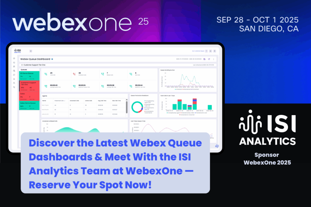 We’re excited to announce that ISI Analytics is a proud sponsor of WebexOne 2025, taking place this year in beautiful San Diego! This annual event brings together the best minds in collaboration, customer experience, and innovation—and we’re thrilled to be part of it. 🚀 See What’s New: Our Webex Queue Dashboard