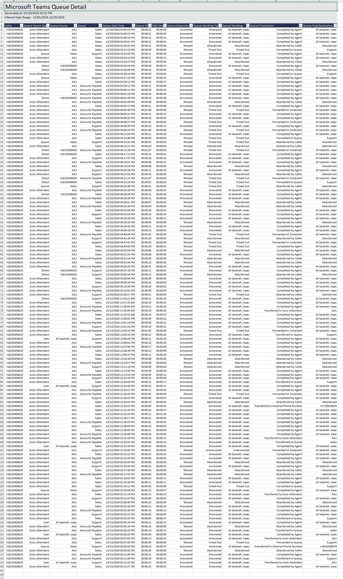 - Agent Start Time, Agent End Time, Talk Time, Queue, Queue Location
